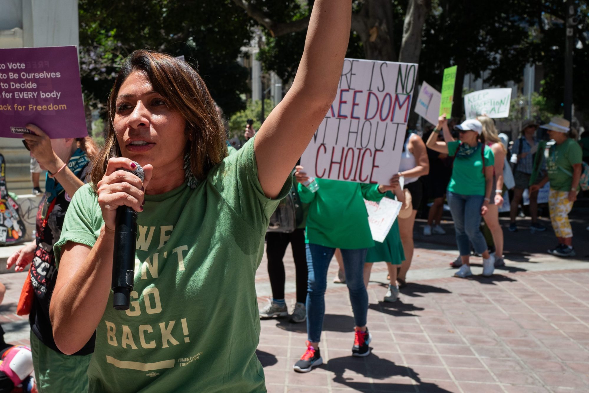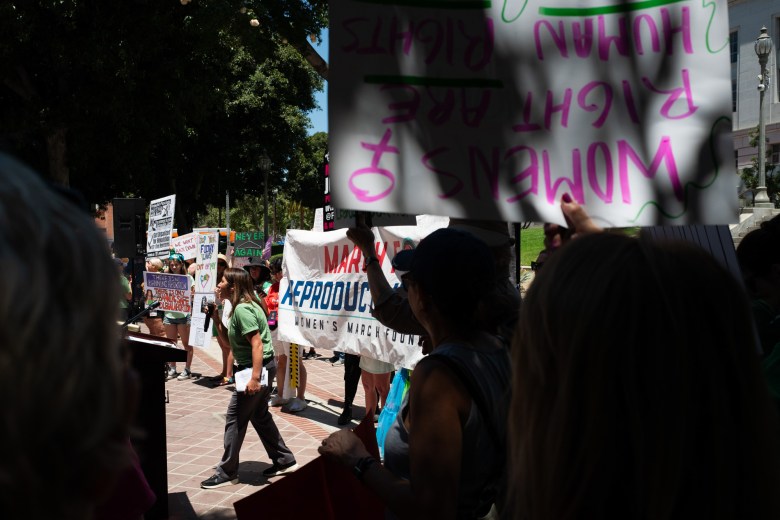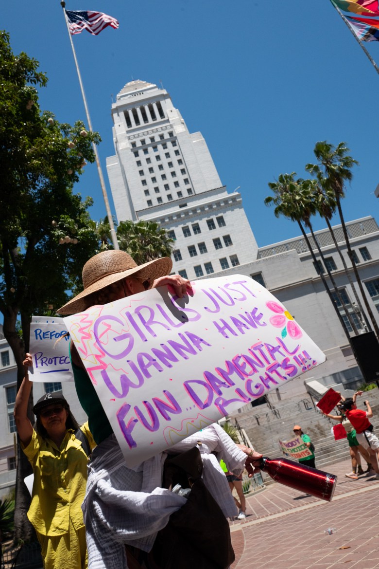 Chants of “We won’t go back!” echoed from the front of Los Angeles City Hall, as women and allies held up signs reading, “Women’s rights are human rights,” “My body, my choice,” and “Abortion is healthcare.”